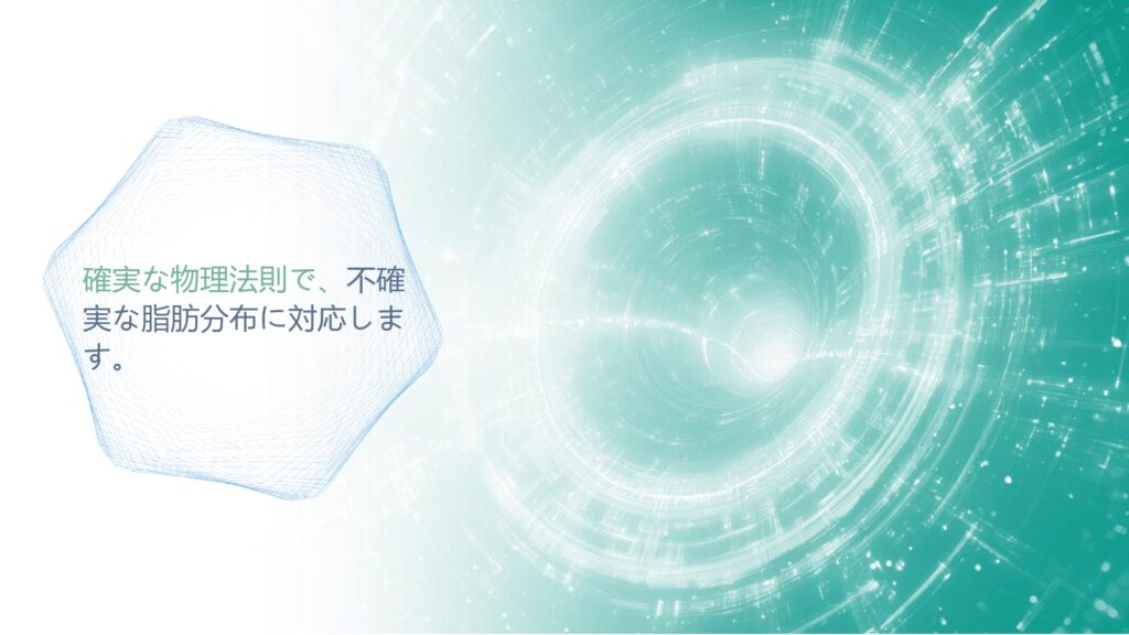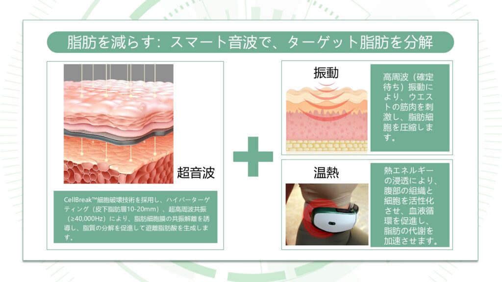 • 「CellBreak 細胞破壊技術」を採用したスマート音波です。皮下10〜20mmにある脂肪層を正確にターゲットし、40,000Hz以上の超高周波で脂肪細胞を共振させ、分解を促進。脂肪が体外へ排出されやすい状態を作ります。