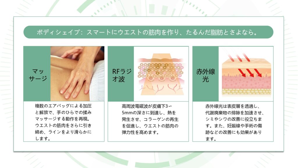 • 皮膚の下3〜5mmまで届く高周波の電磁波が熱を発生させ、新しいコラーゲンの生成を促進。肌の弾力性を高め、ハリのあるウエストラインを作ります。
