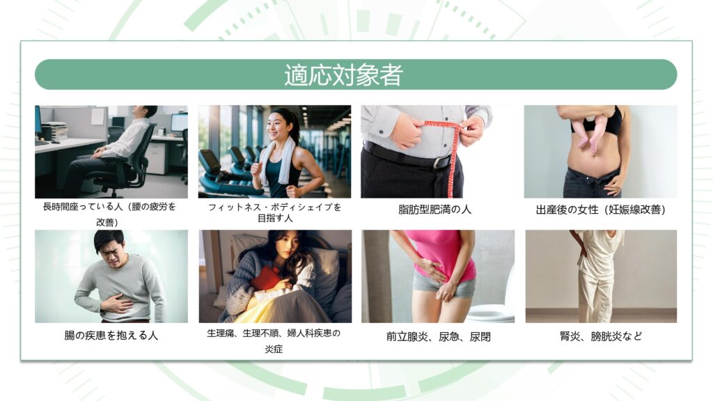 • 7.8Hzという特殊な超低周波エネルギーが、最大20cmの深さまで浸透し、体の内側に「SPA」のようなケアを提供します。これにより、腰痛や腸の問題、婦人科系の悩みに関連する炎症を和らげ、腸の働きを整える効果が期待できます。さらに、腸の規則的な動きをスマートに促し、栄養の吸収効率を高めることで、内側から体を整えます。